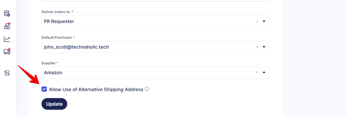 - Allow Use of Alternative Shipping Address (optional) — activating this checkbox ensures that the shipping address entered during checkout is automatically filled in the Precoro document, even if it differs from your default location. Additionally: