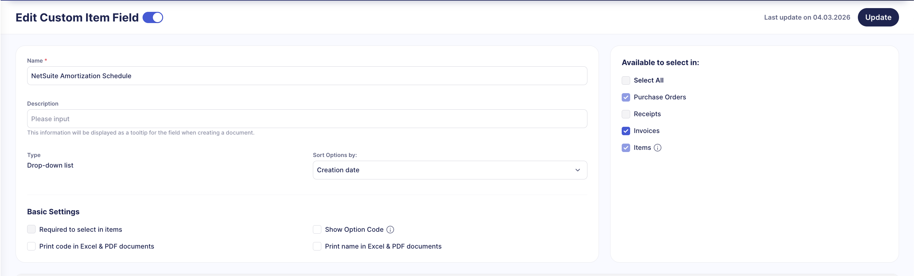 When this checkbox is enabled, Precoro imports NetSuite Amortization Templates where the Type is set to Standard.