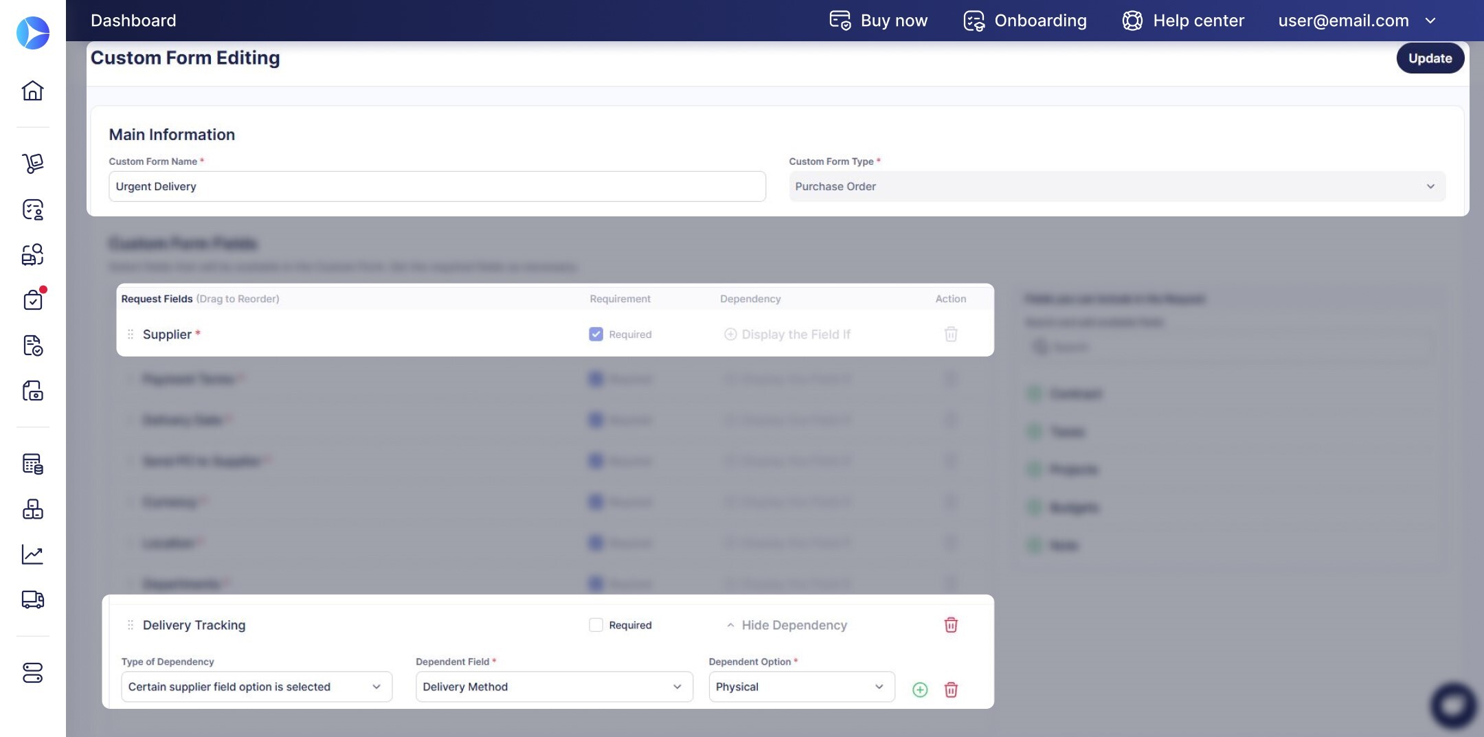 - Configure dependencies between the fields in a form to make the workflow even more automated. You can display or hide document fields based on other document fields or custom supplier fields.