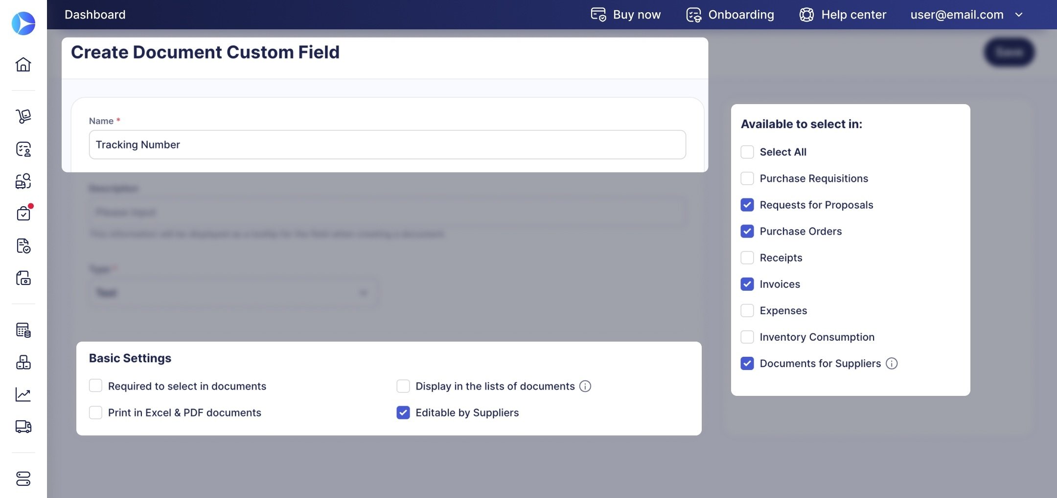 - Available in Documents for Suppliers means suppliers will see the value of this custom field. Learn more in this section.