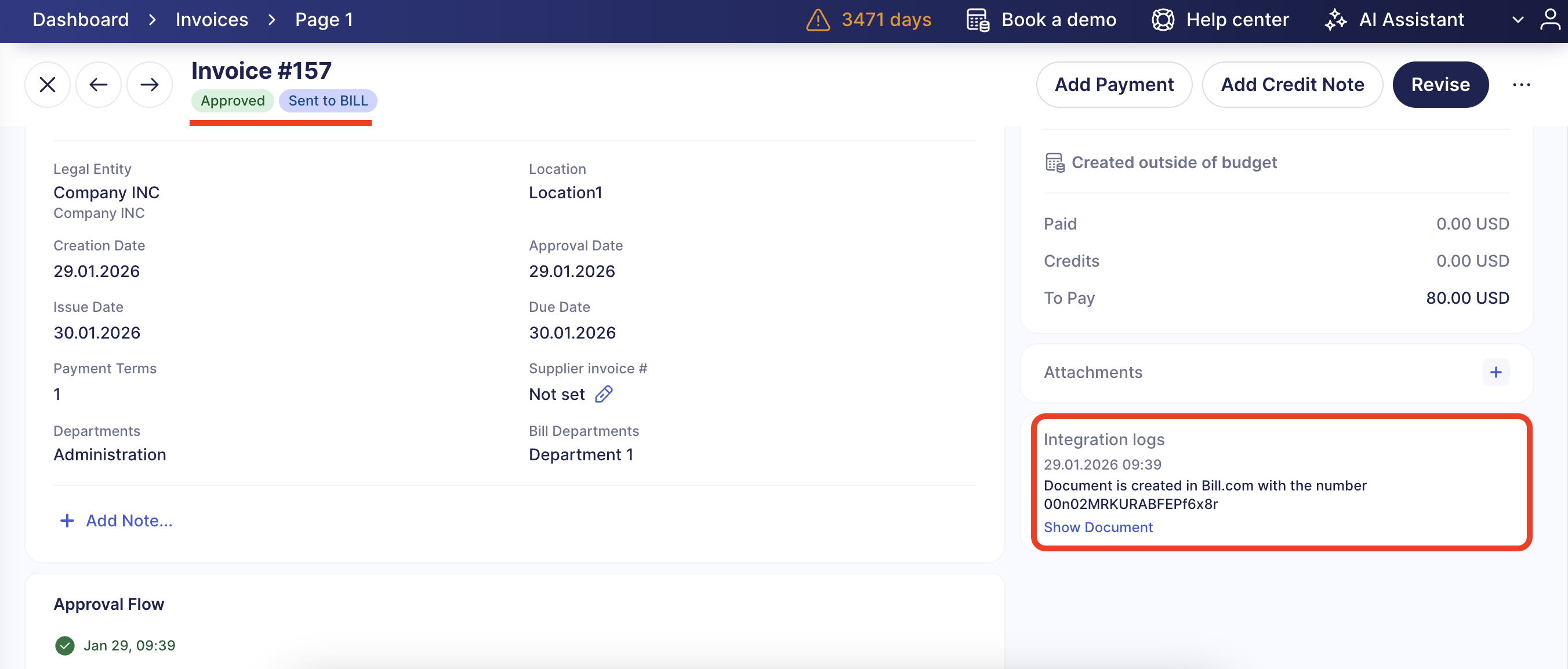 When you cancel an unpaid invoice in Precoro, it is also canceled in Bill.com. You’ll be notified that the invoice has been canceled in the Integration logs section.