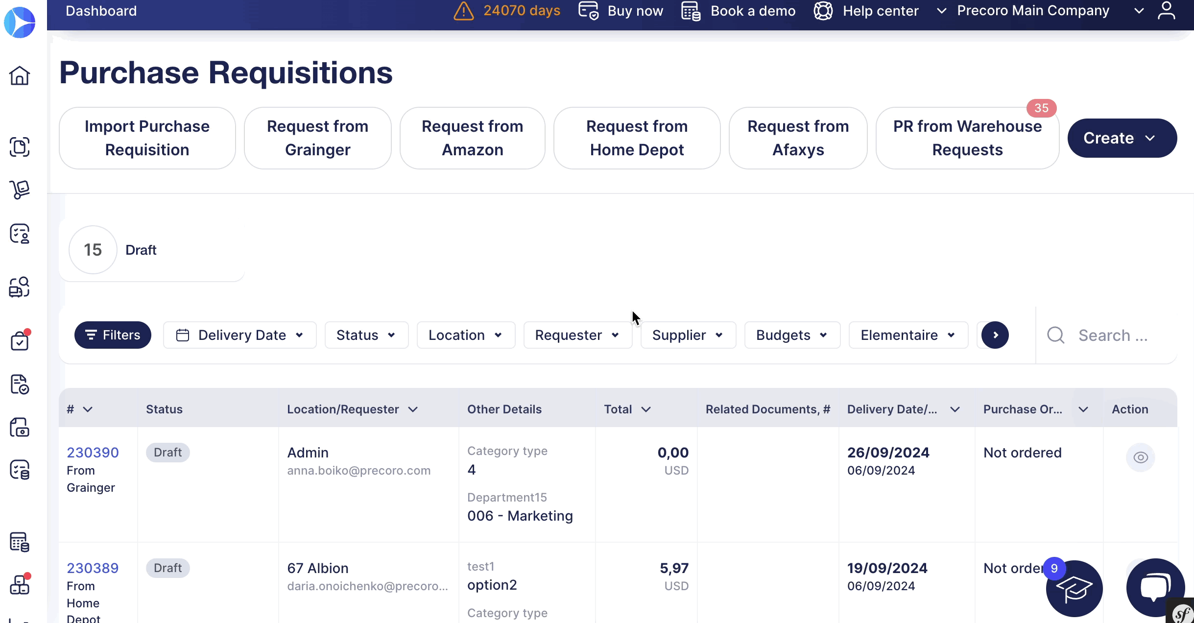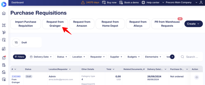 4. You will be automatically redirected to Precoro with the created Purchase Requisition on the Draft status.
