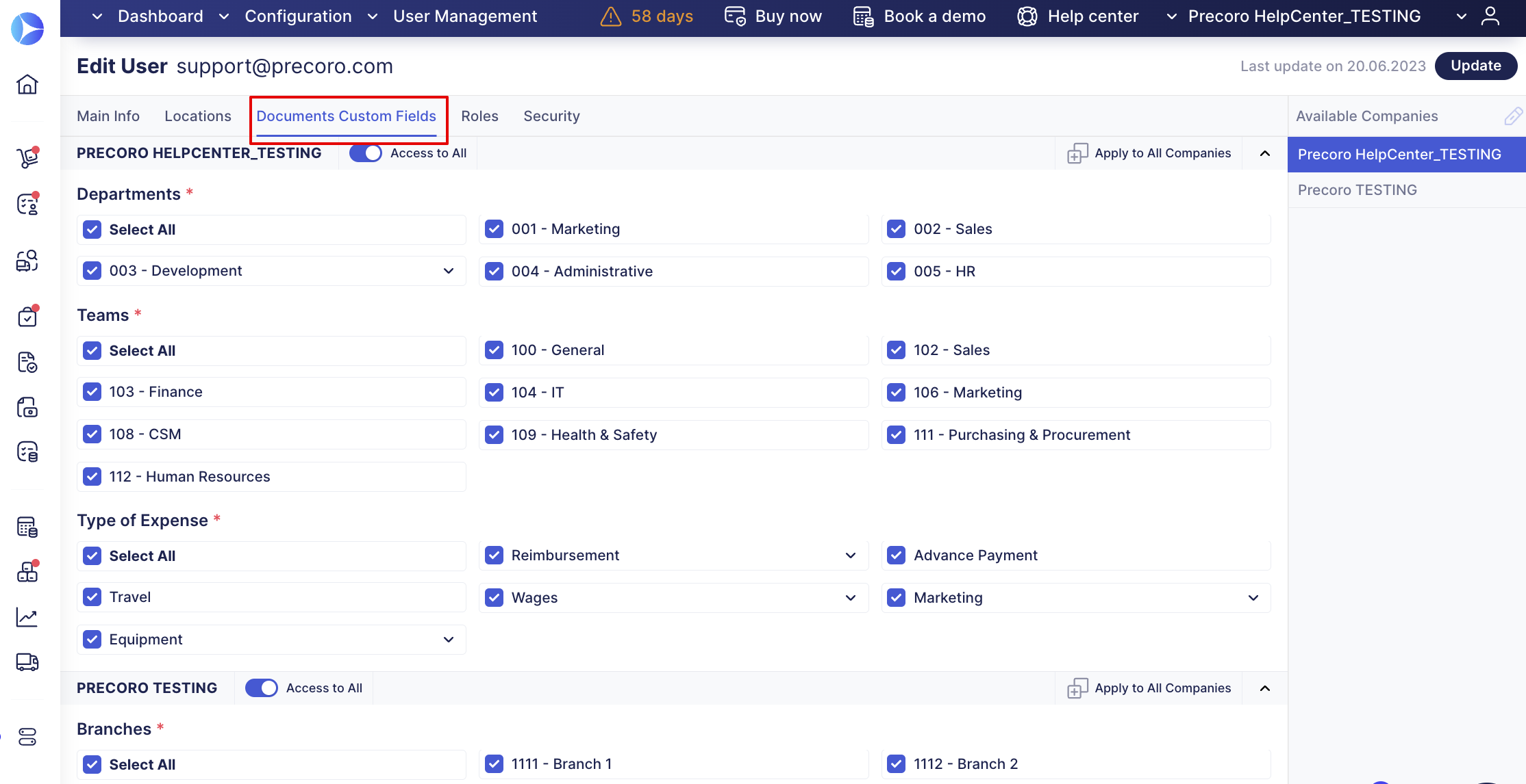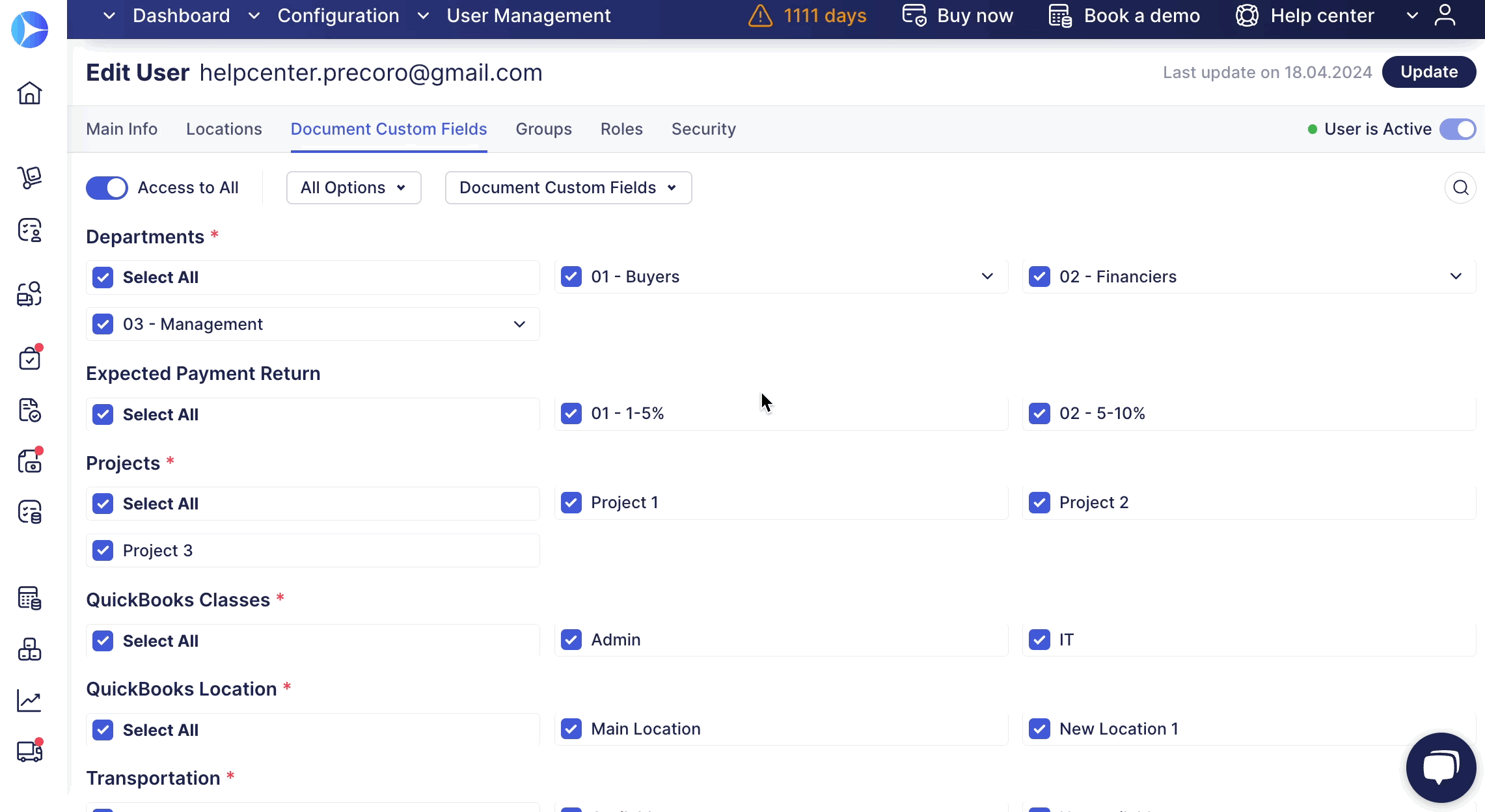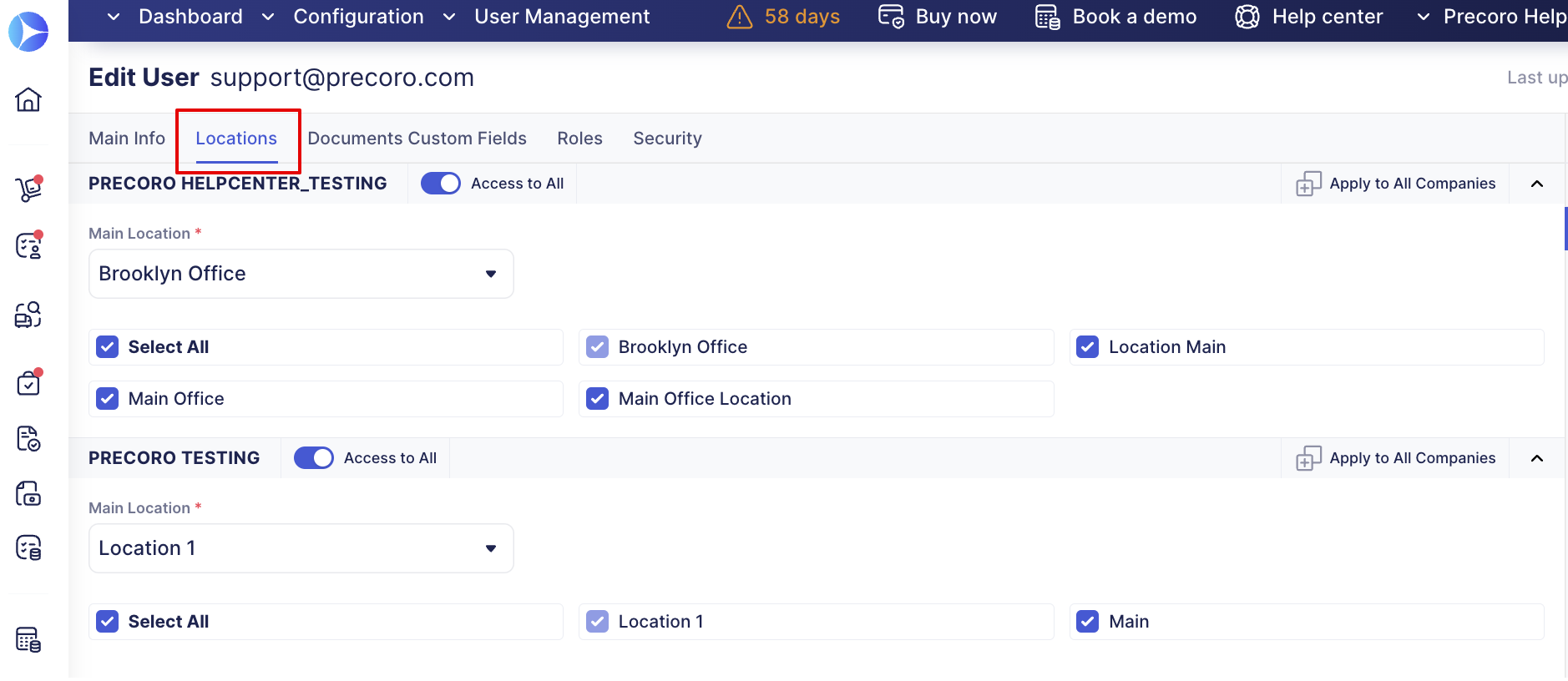 Access to All — can at once grant and revoke access to all Locations and Custom Fields for Documents options in a specific company.