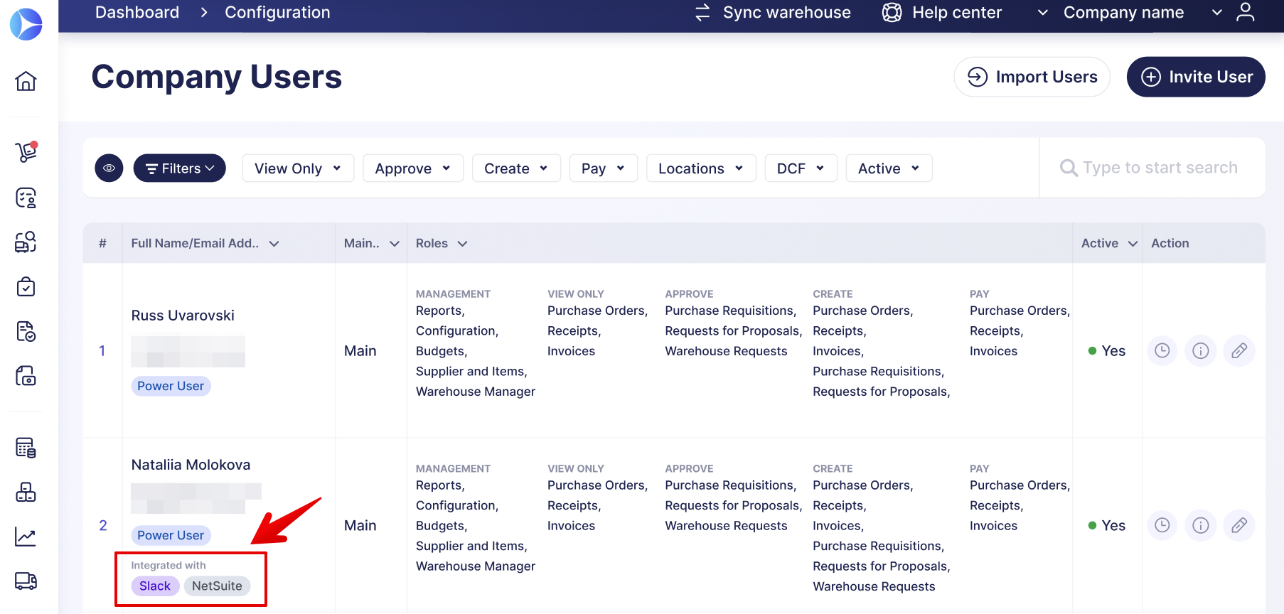 Also, if your company has an active integration with our partners and you have Integrated Company Users. In that case, there will be a corresponding display that will quickly allow you to assess which user is part of the integration: