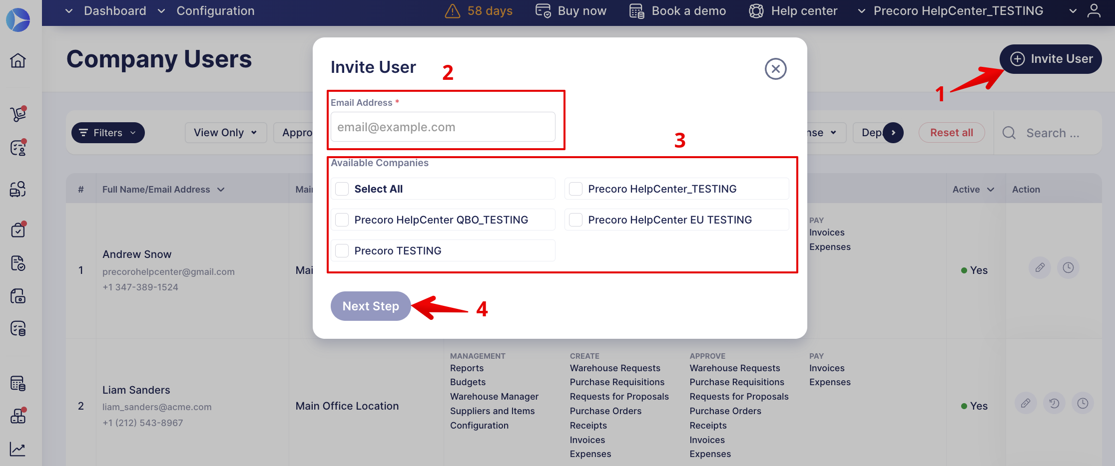 To invite a colleague to one of your companies in a multi-company account, follow the steps below on the Configuration → User Management page: