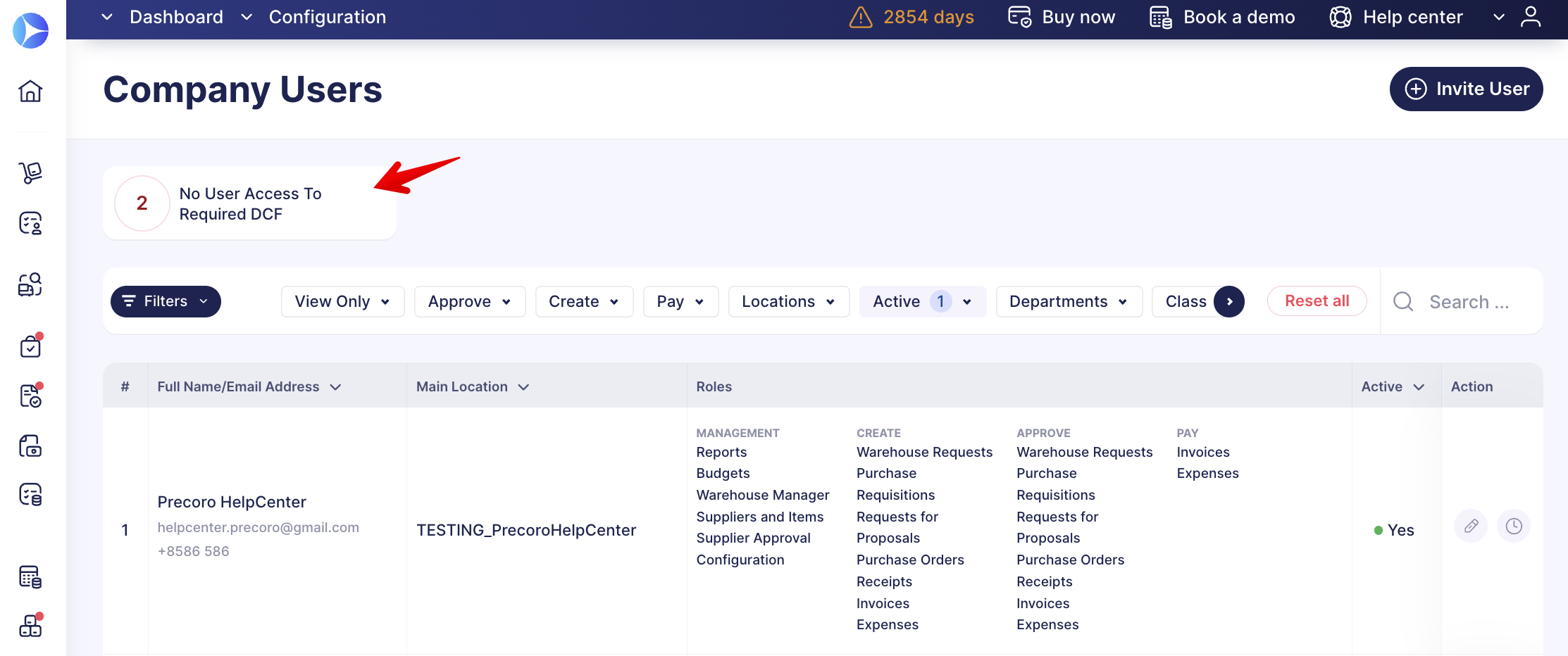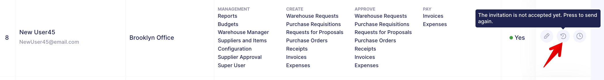When clicking the infocard, you will see the list of users who did not receive invitations to join Precoro as their profiles were not finalized. You can fix that by checking their access and resending the Invite.