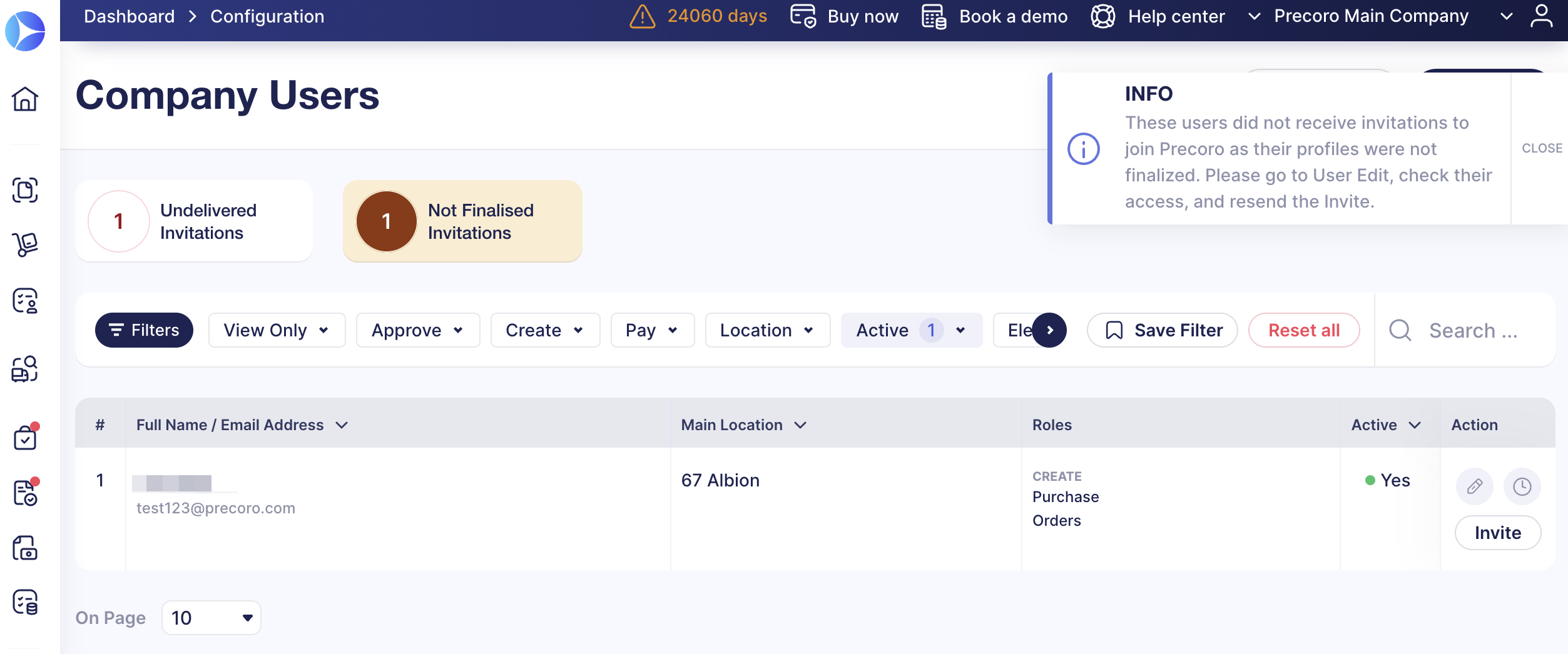 - The Not Finalised Invitations infocard is intended to make the admin’s life easier and let them know that there are users with incomplete settings and unsent invites to join Precoro.