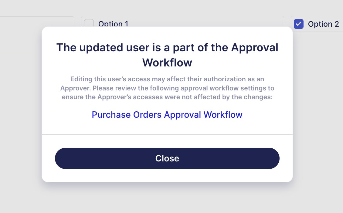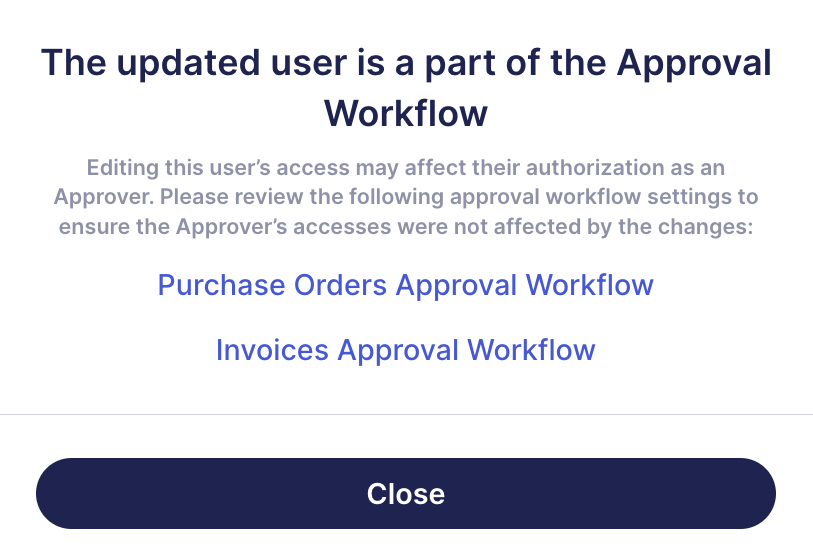 Every time the company administrator tries to change the user rights and roles, we will let them know if the updated user is part of the Approval Workflow, and editing the user’s access may affect their authorization as an Approver. We will prompt the administrators to review the current approval workflow settings to make sure the Approver’s accesses were not affected by the changes.