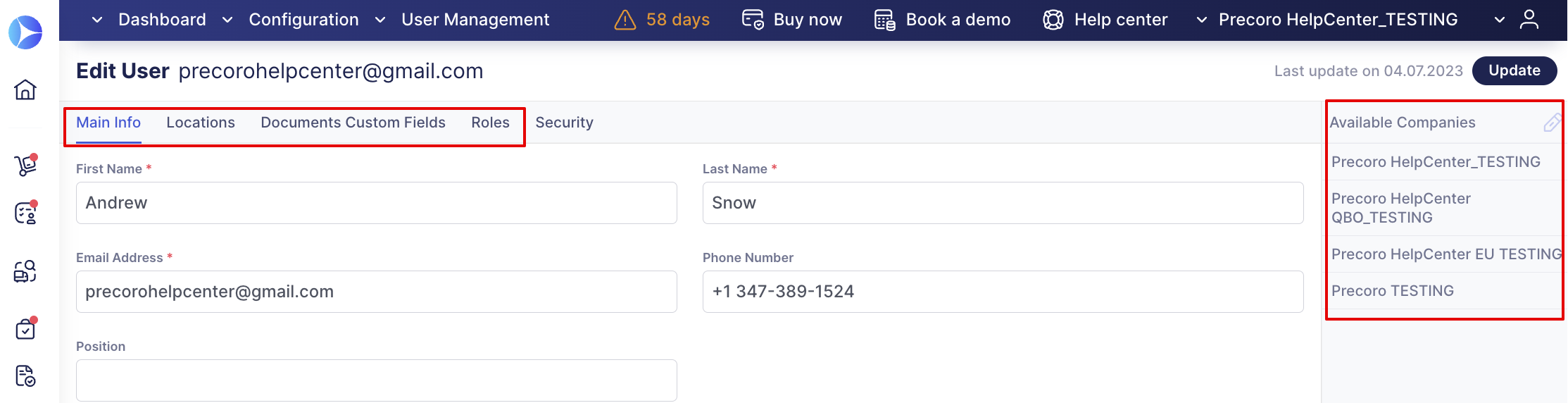 In a multi-company account, you will see the Available Companies for the user listed on the right. The user’s main info would be already predefined, as it is shared between all the companies.