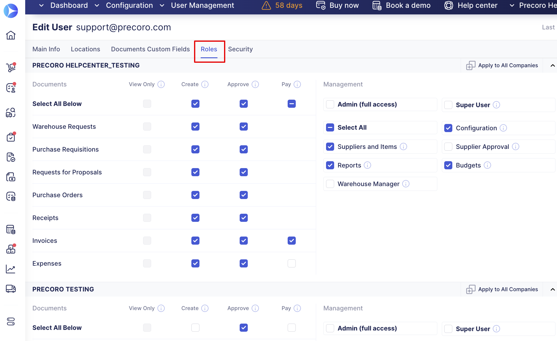 - Apply to All Companies — this can help you automatically duplicate the specific set of User Roles, Locations, and Custom Fields for Documents and apply them to all available companies.