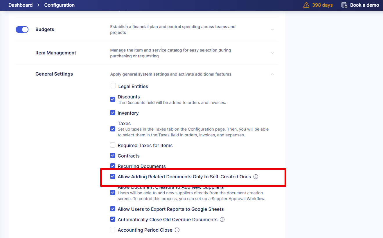 You can additionally grant access to view only self-created documents when creating new related ones, find the needed settings in the Configurations → Basic Settings → Document Setup → General Settings → Allow Adding Related Documents Only to Self-Created Ones.