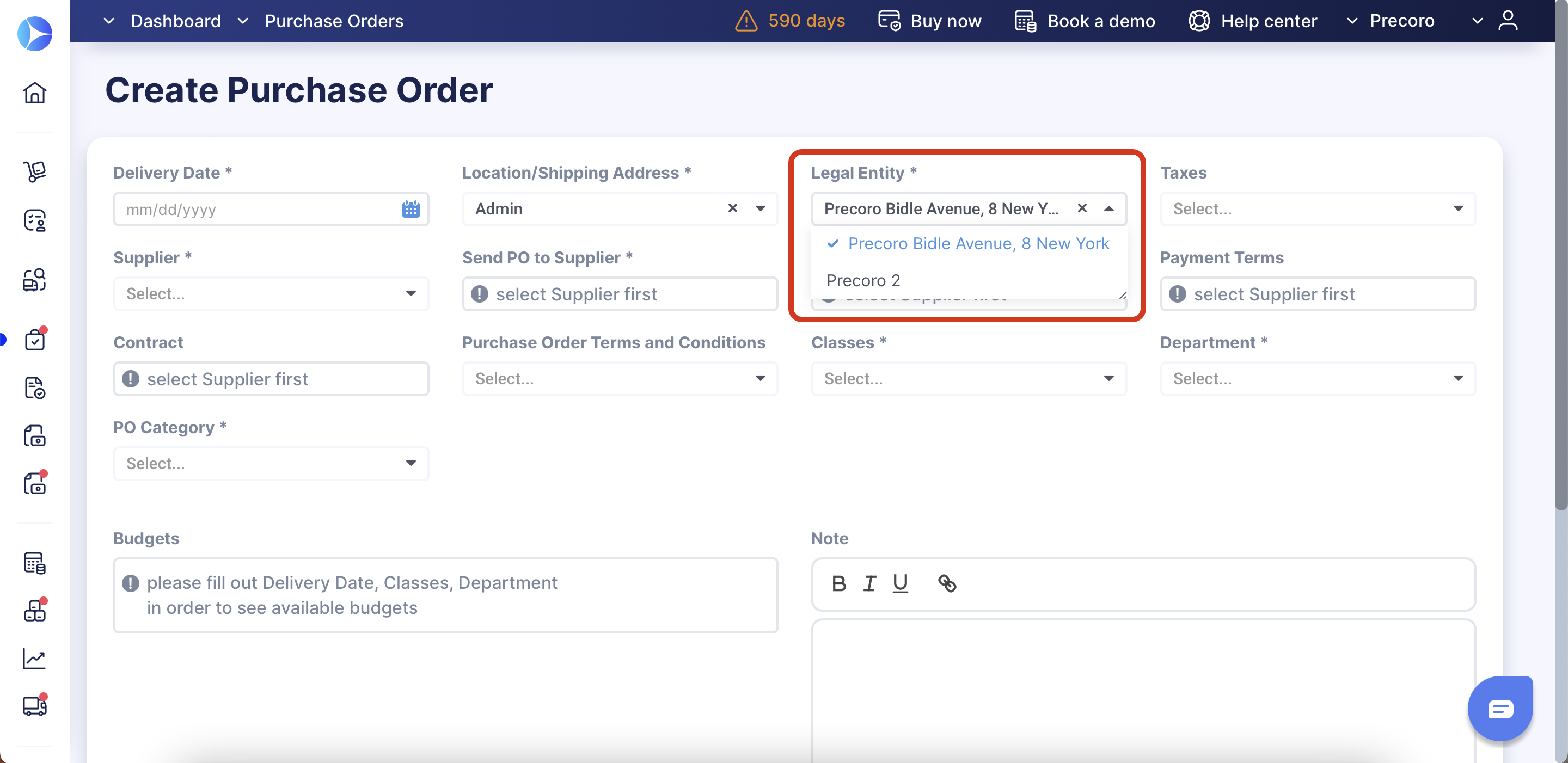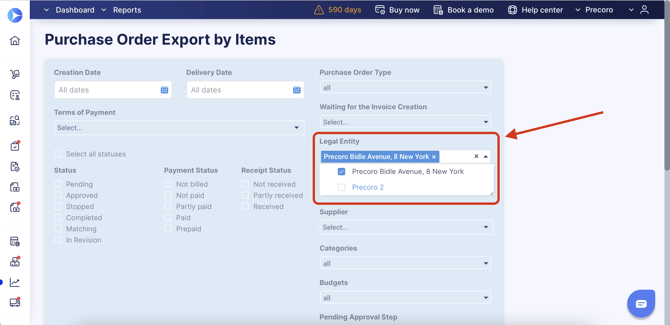 In Precoro, you can work with one or multiple legal entities. When creating orders or expenses, select the relevant entity and analyze the data accordingly.