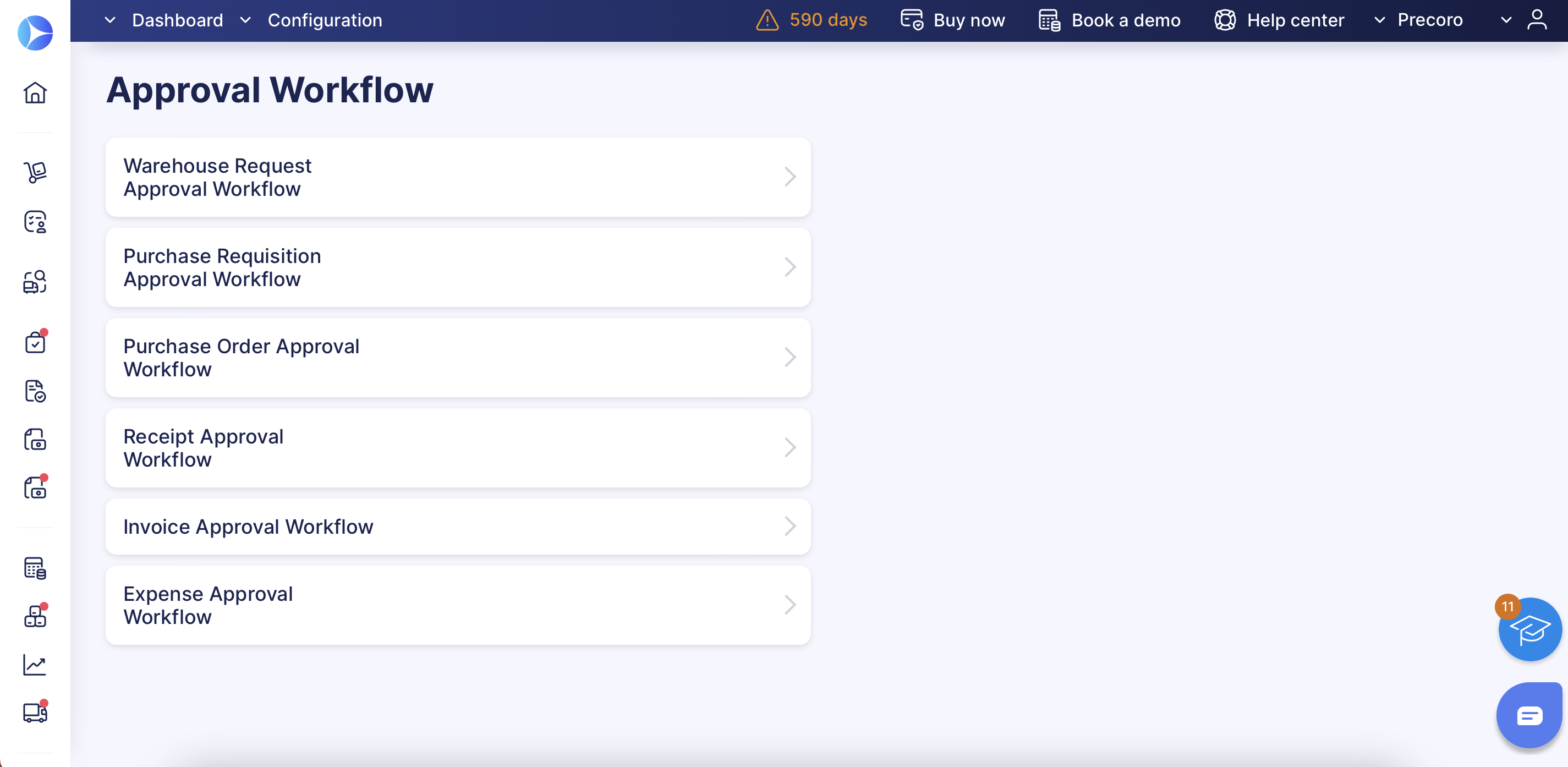 1. In the left-side menu, open the Configuration page and go to Approval Workflow.