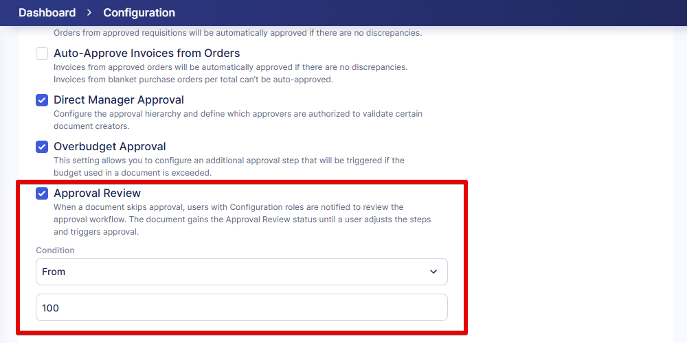 - Define the document total threshold for triggering the approval review. You can choose from options like Any, Less or equal, From, or From To. For example, to auto-approve documents under $100 and review those $100 and above, choose From $100.