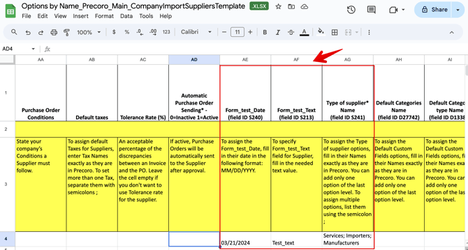 If you need to add two or more contacts per supplier, add more columns in the file (works only with contacts). Copy the column title and enter the information.