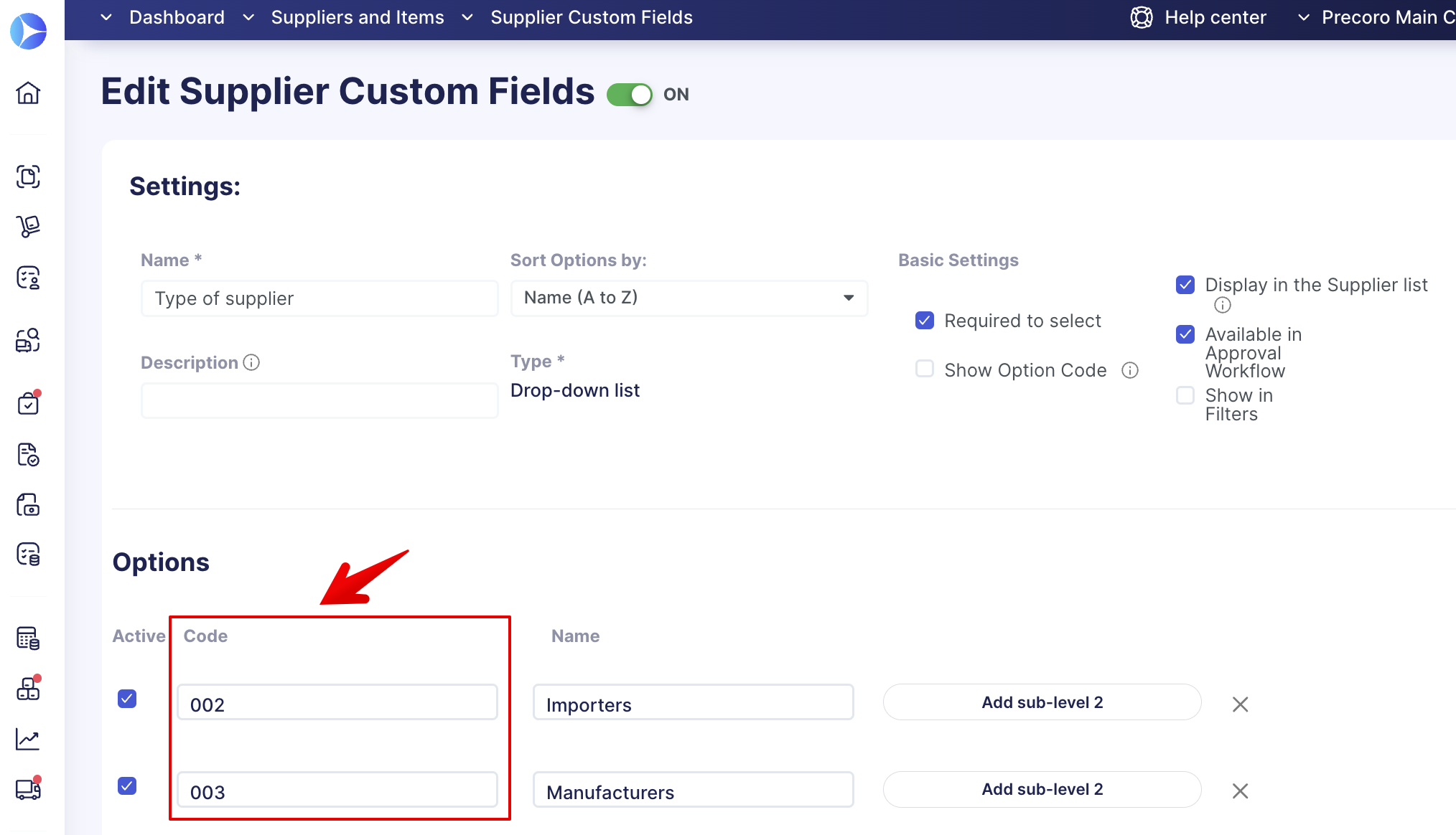 - If you have selected the Code option in the settings, then SCFs of the selected type will be assigned by the code values you are entering. Please make sure to fill in the codes exactly as they are in Precoro. If not, you will see the corresponding flesh prompting you to correct the values.