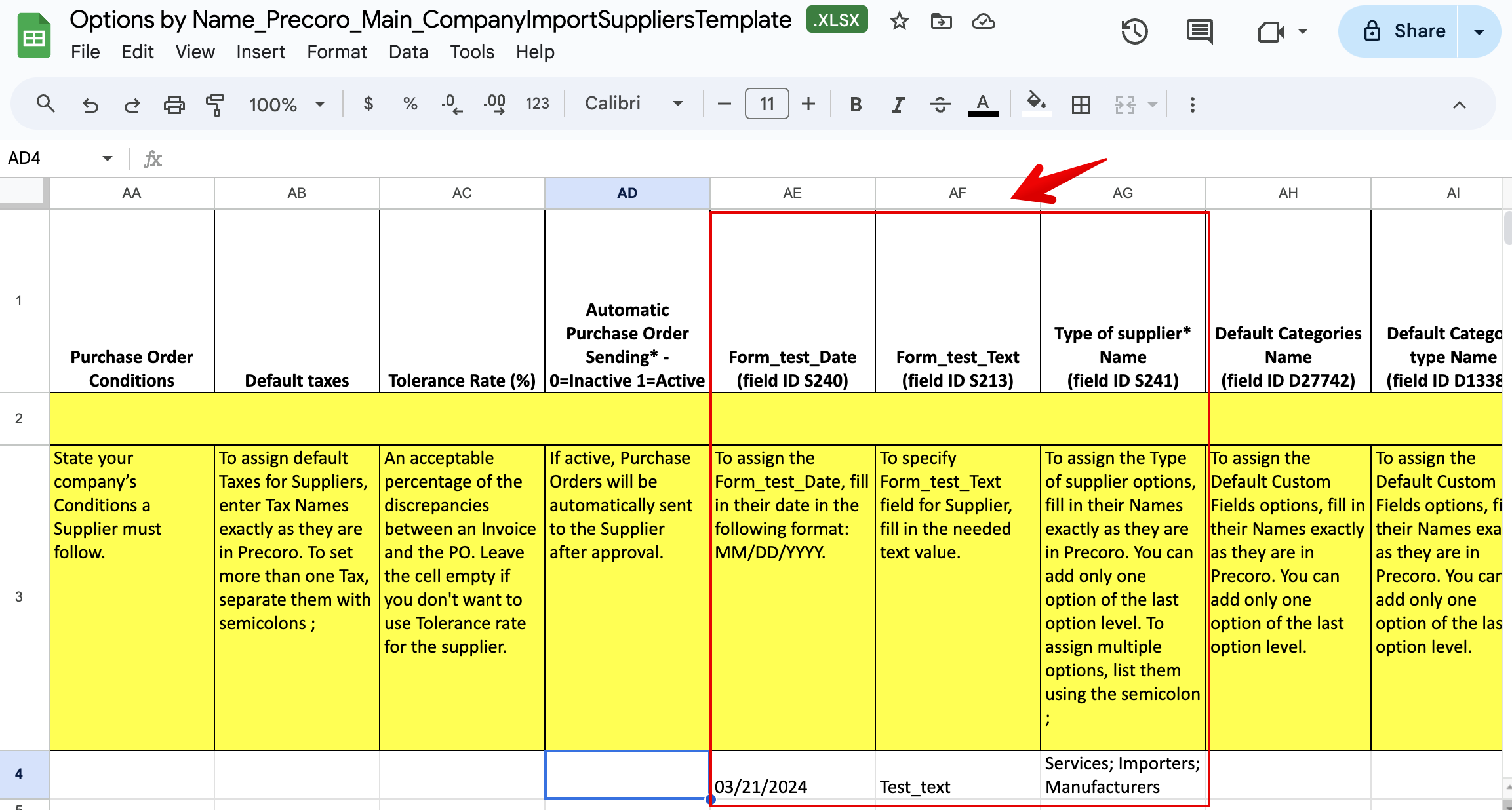 - It might be easier and quicker to copy and paste any current codes and payment terms into the file from Precoro: