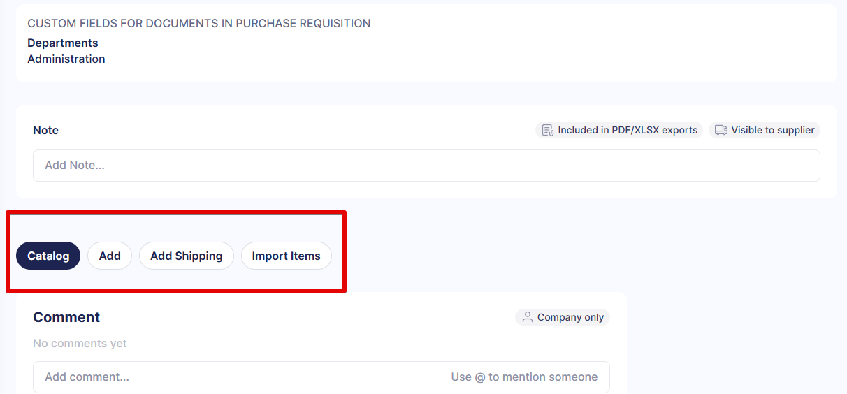 💡Please note: When this feature is active, users have more options when adding items: they can pick an item from the Catalog, add all the necessary information manually, or import items in bulk.
