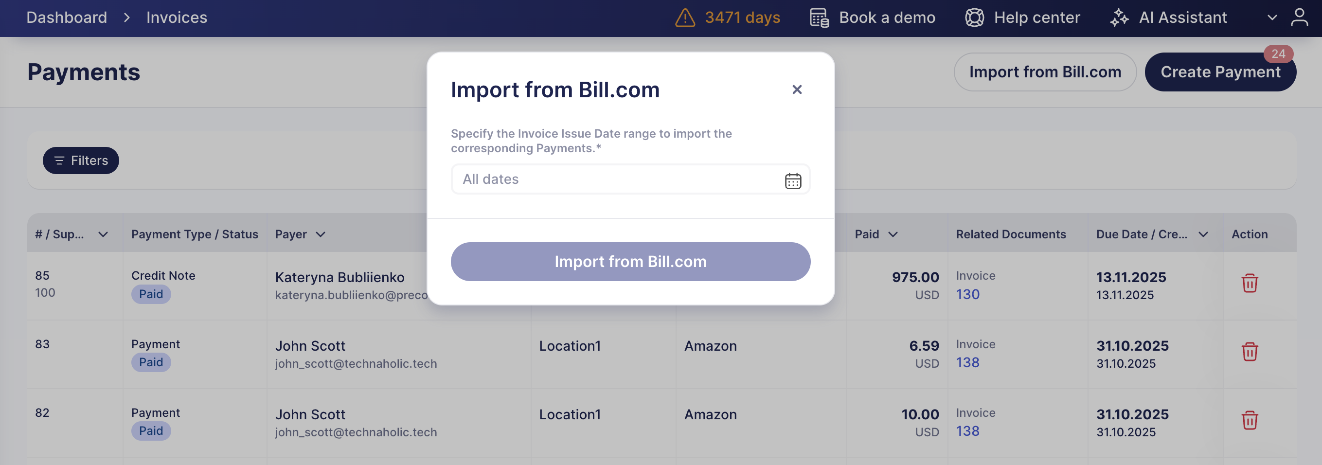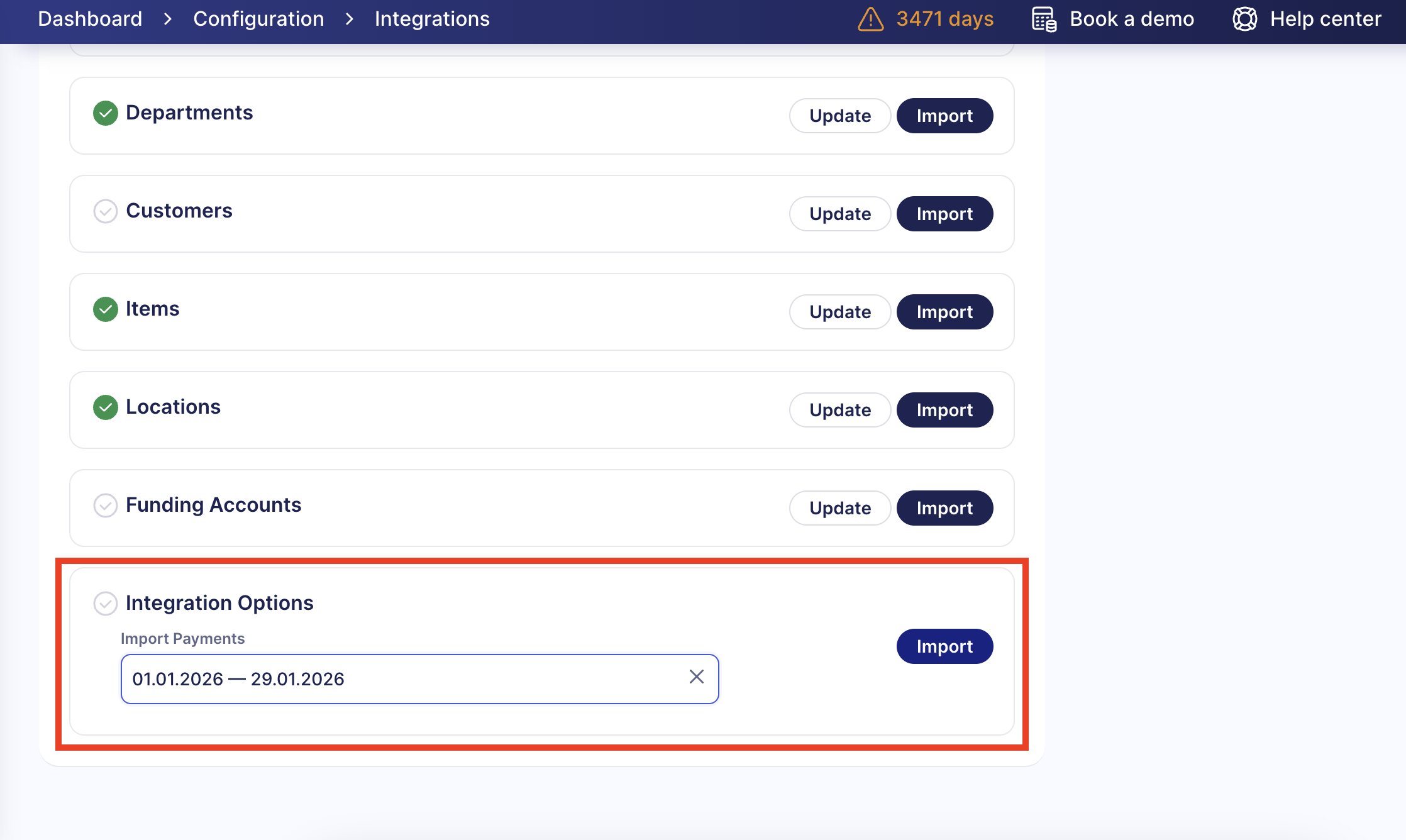 All payments for the integrated invoices will be imported, and you’ll see the number of added payments in a flash message.