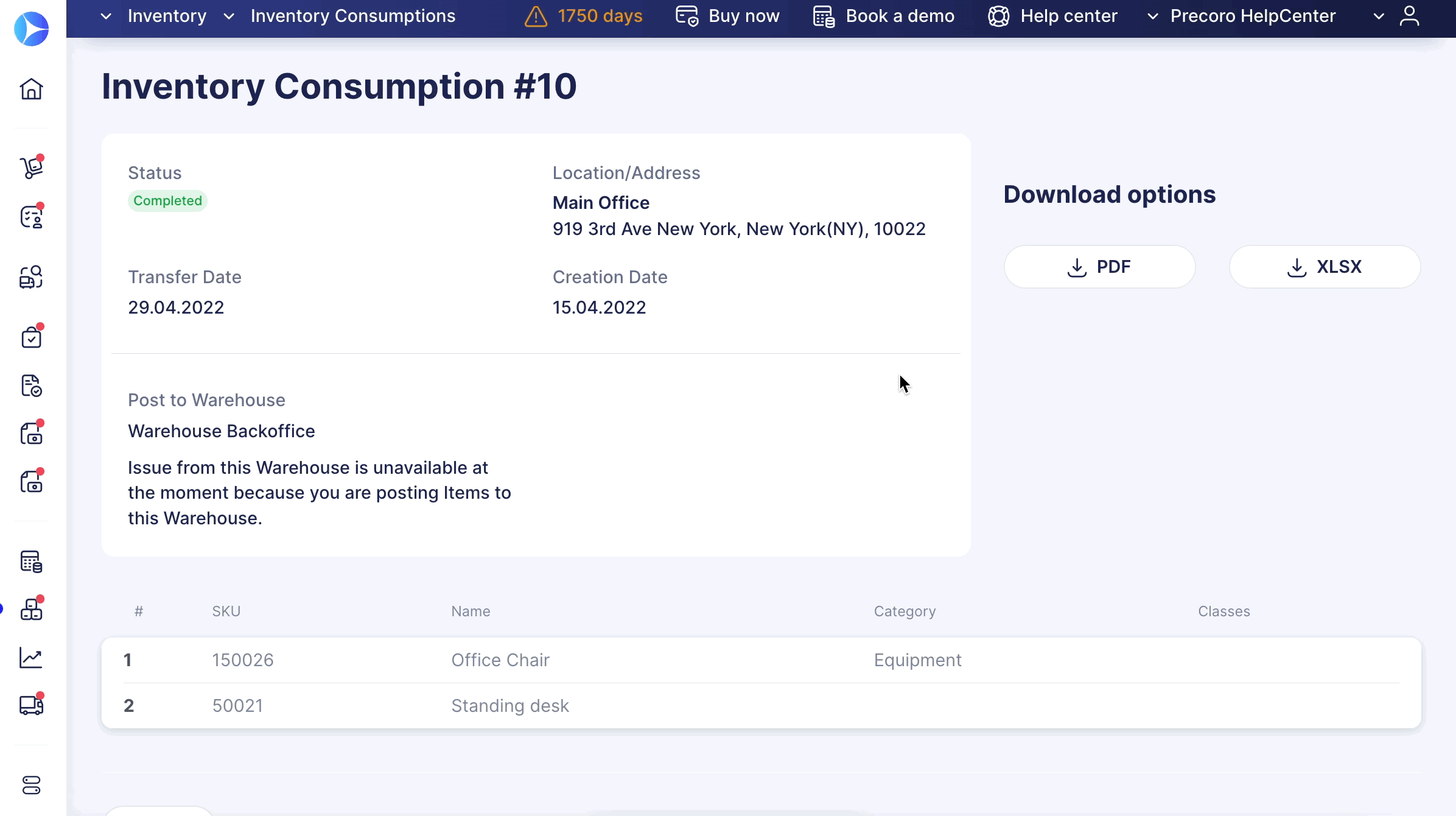 You can export an Inventory Consumption in PDF or XLSX Formats by selecting the needed option: