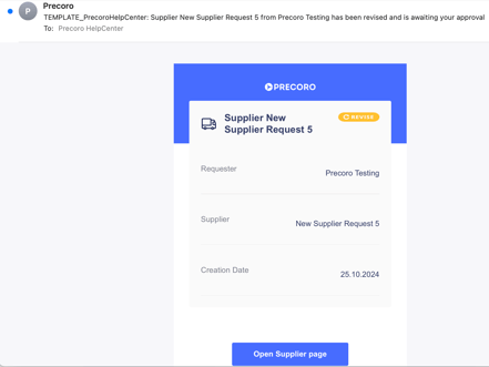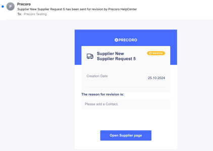 - When the approver returns the Supplier for revision, they leave a comment about the data they want clarified. You will receive an email containing all that information for you to properly make needed changes to the Supplier profile:
