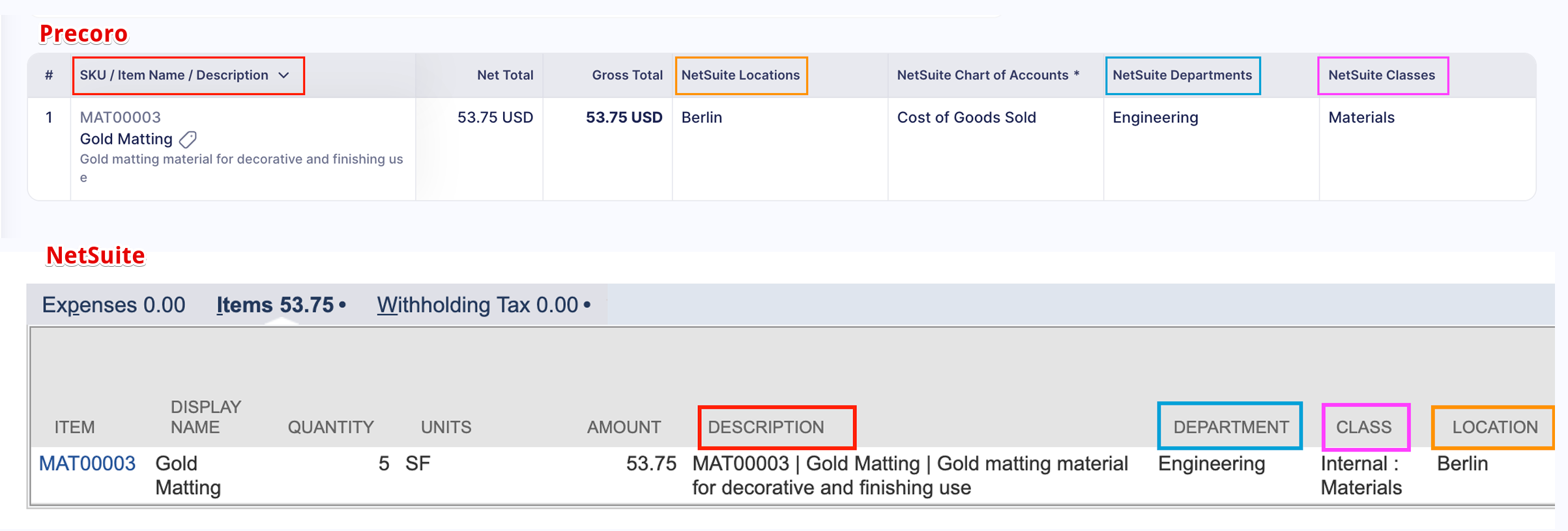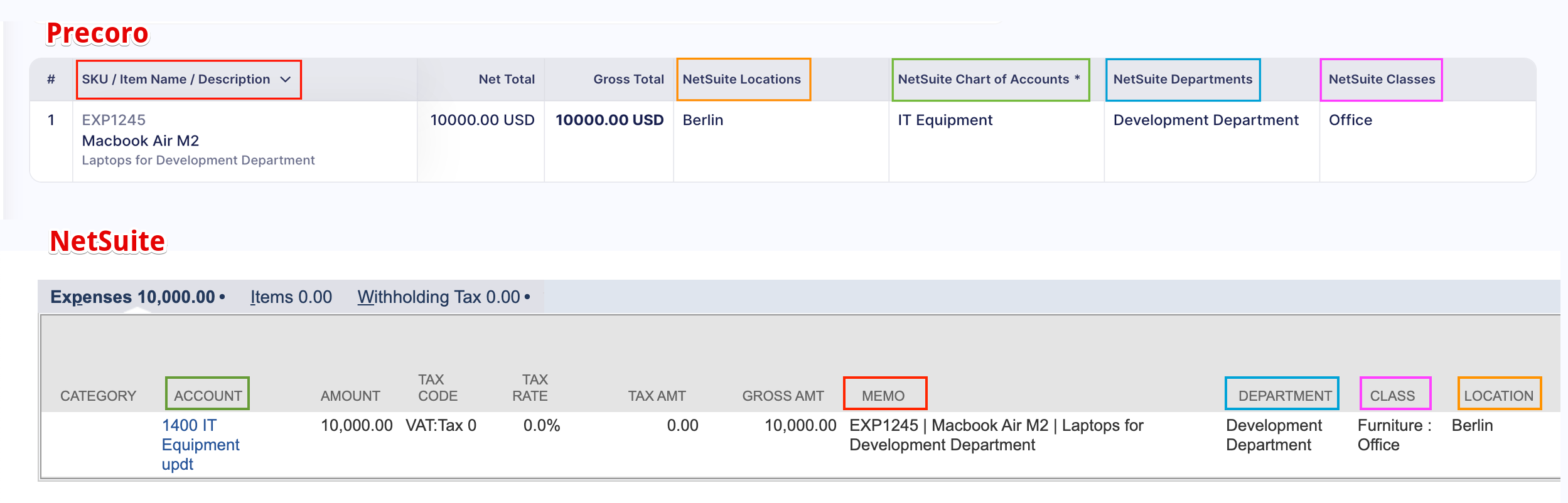 | Field in Precoro | Field in NetSuite |