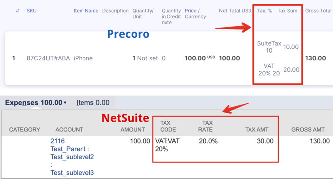 Only one item and document tax will be transferred to NetSuite (even if you have added several taxes in Precoro to the document or item). Usually, the last tax you have added will be displayed in NetSuite.