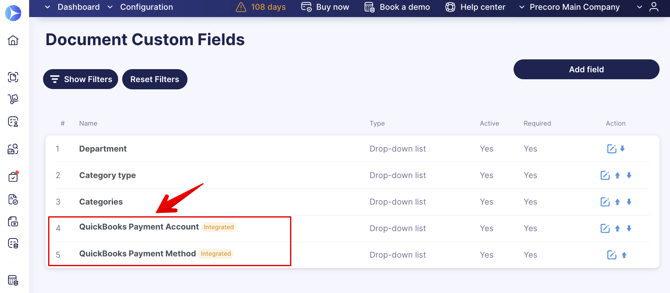 - The Payment Method and Account need to be imported and integrated from QuickBooks. You can verify this setup in the Custom Fields for Documents.