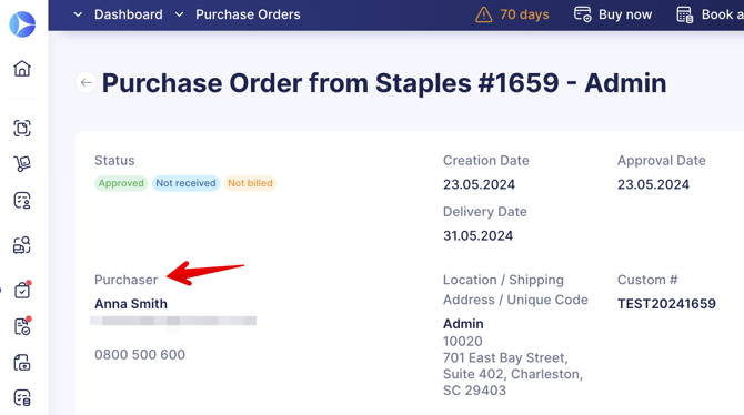 6. Check the created Purchase Order, and if the document is completed with all the required Custom Fields for Items/Documents and your company has no Approval Workflow in place, the PO will be immediately confirmed and sent to Staples. If there is no Approval Workflow in place, the Purchase Order will be sent to the supplier after all the necessary confirmations.