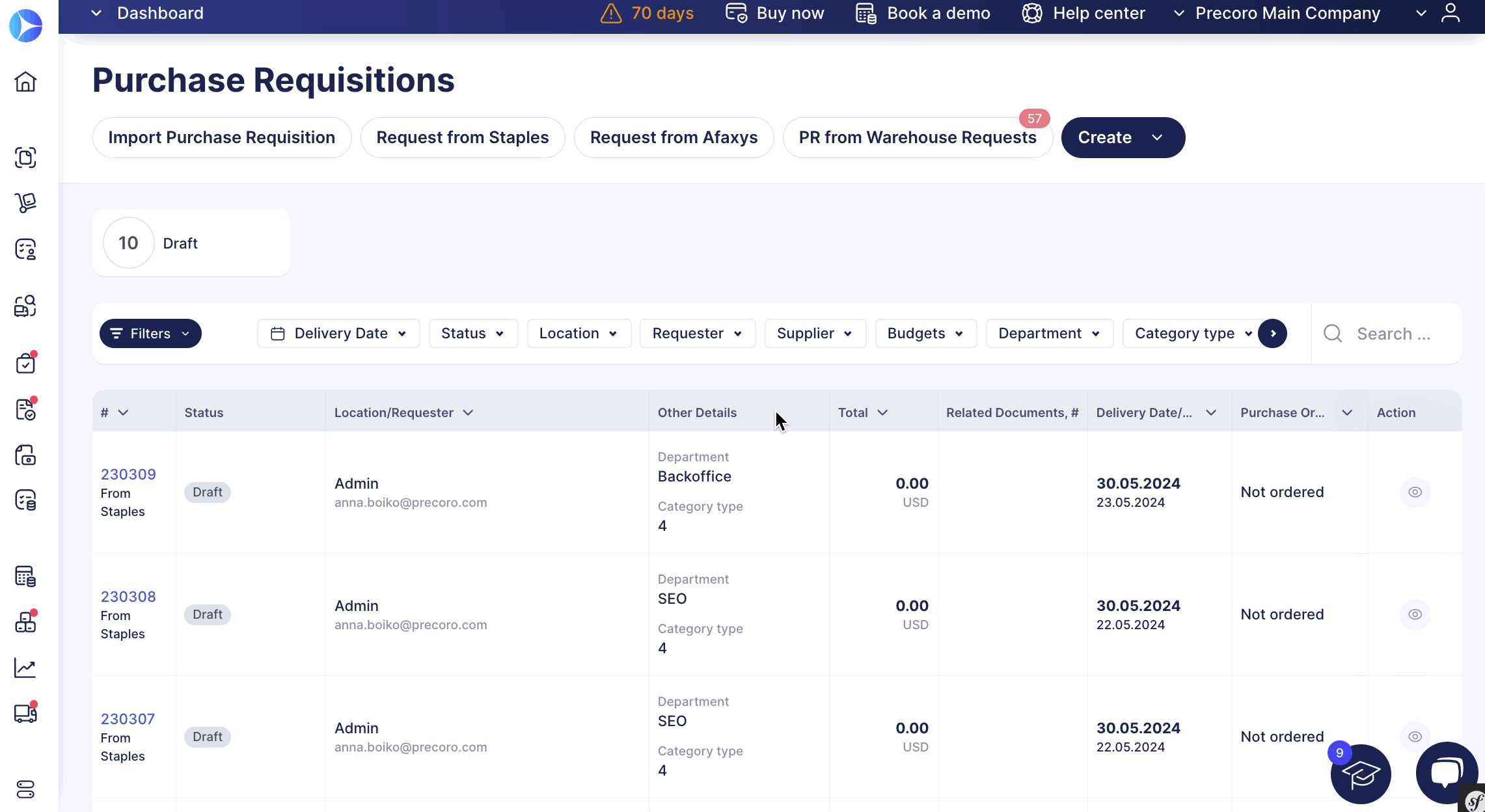 5. You will be automatically redirected to Precoro with the created Purchase Requisition on the Draft status.